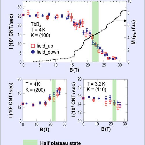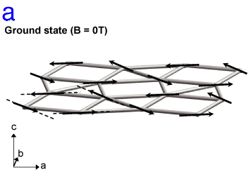The intensity exhibits multiple steps corresponding to the magnetization steps. By repeating measurements at several Bragg peaks, the magnetic structure model (animation, image b) could be determined for the half-plateau state where the magnetization is half that of the saturation. Surprisingly enough, the structure consists of a stacking of ferromagnetic and planar antiferromagnetic blocks. This shows the large contribution of the biquadratic exchange interaction causing the orthogonal arrangement between the magnetic moments.