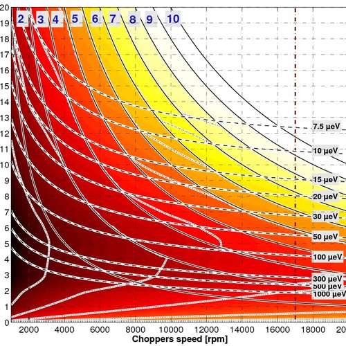 As an example, a wavelength of 5 Å and a chopper velocity of 8500rpm give a resolution of 100 µeV with a frame overlap ratio of 3 (as we are close from the boundary a ratio of 2 might be also correct).