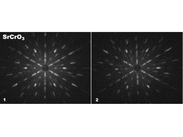 OrientExpress is a valuable tool for the rapid alignement of crystals relative one to the others. Here, the sample for an inelastic experiment on IN5 was made of two crystals of SrCrO3. The patterns below allowed for an accuracy of the relative aligment less than 0.5 degree.