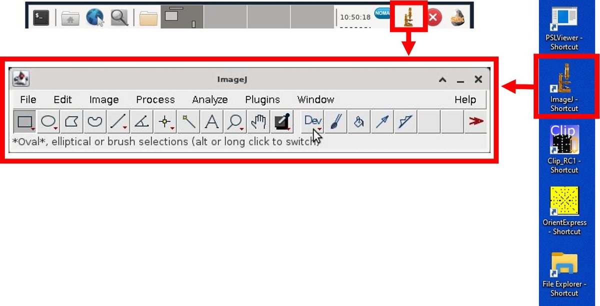 ImageJ is installed on both the Linux and Windows 10 machines.  Double-click the ImageJ icon to start the software.
