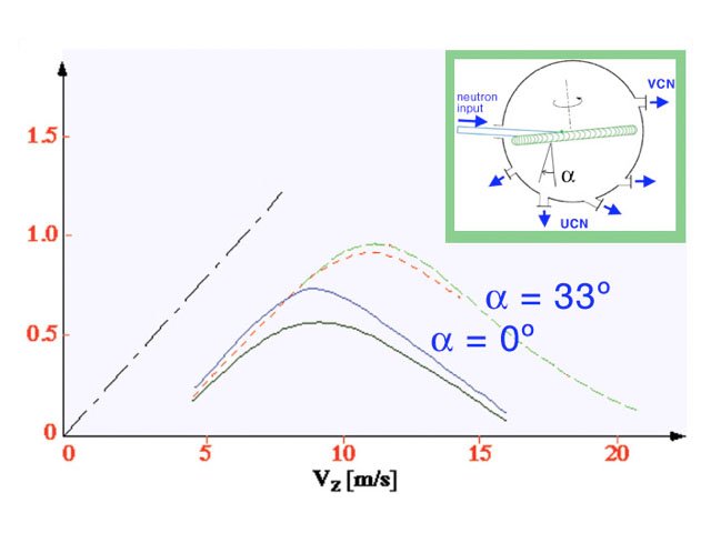 Flux of neutrons function of axial velocity (v)Dashed-dotted line: Maxwell spectrum at turbine exit.Other curves: flux dependence with angle α as measured at several distances from the turbine blades.