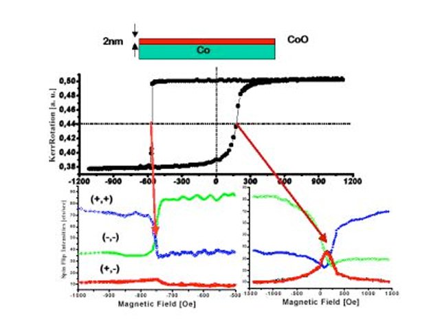 The upper panel shows a magnetic hysteresis, measured by the magneto-optic Kerr effect after field cooling in an external field below the TN.