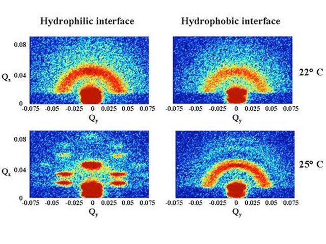 Close to the hydrophilic interface a cubic close packed structure is formed whereas close to the hydrophobic interface a three dimensional powder with a cubic face centred structure is formed.