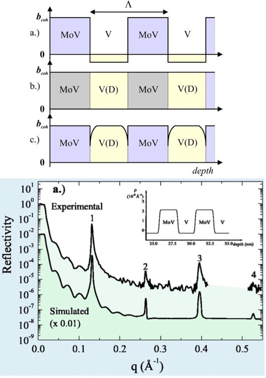 - Figure 2: shows experimental and fitted neutron reflectivity curves of the superlattice: (a) before and (b) after loading with deuterium. The insets to (a) and (b) show the scattering length profiles obtained from the respective fits. In (b) slight overloading and the formation of deuterium-depleted layers at the MoV/V interfaces are observed.