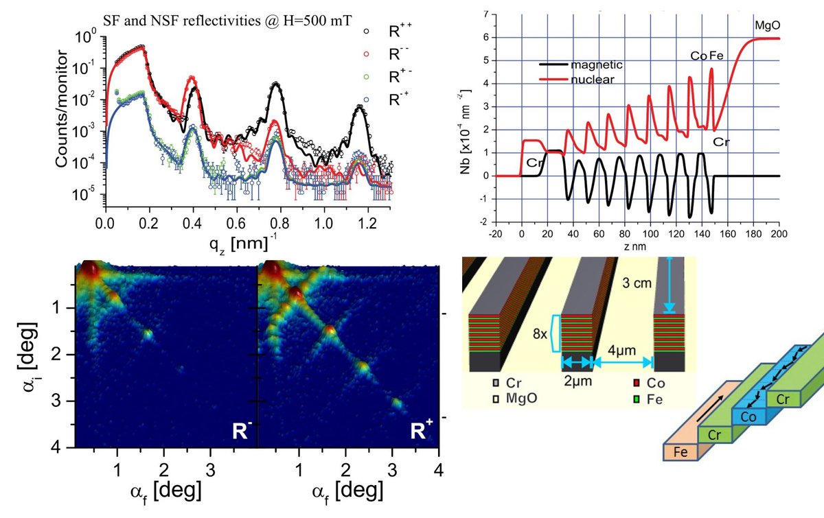 The magnetization reversal of magnetic multilayers with spin-valve like characteristics, patterned into an array of parallel stripes, was structurally and magnetically analyzed, in detail, via x-ray scattering, magnetometry, and polarized neutron reflectivity. Each stripe contains a multiple repetition of the layer sequence [Fe/Cr/Co/Cr]. X-ray and neutron scattering maps of the patterned multilayer show rich details resulting from the superposition of Bragg peaks representing the lateral in-plane periodicity and the out-of-plane multilayer period. Detailed analysis of specular and off-specular polarized neutron intensity was used to ascertain the antiparallel alignment of the Co and Fe magnetization within the kink region of their combined hysteresis loop between the coercive fields of Fe and Co layers. This includes also an examination of domain formation and inter- as well as intra-stripe correlation effects upon magnetization reversal. Our combined study shows that the shape induced anisotropy via patterning is capable of overriding the four-fold crystal anisotropy but is unable to eliminate the ripple domain state of the Co layers, already present in the continuous multilayer.