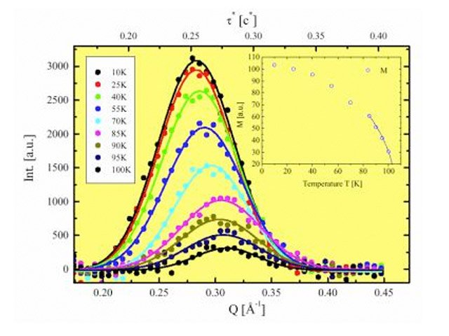 Simultaneously, the intensity decreases due to a loss of long range magnetic order with increasing temperature.
