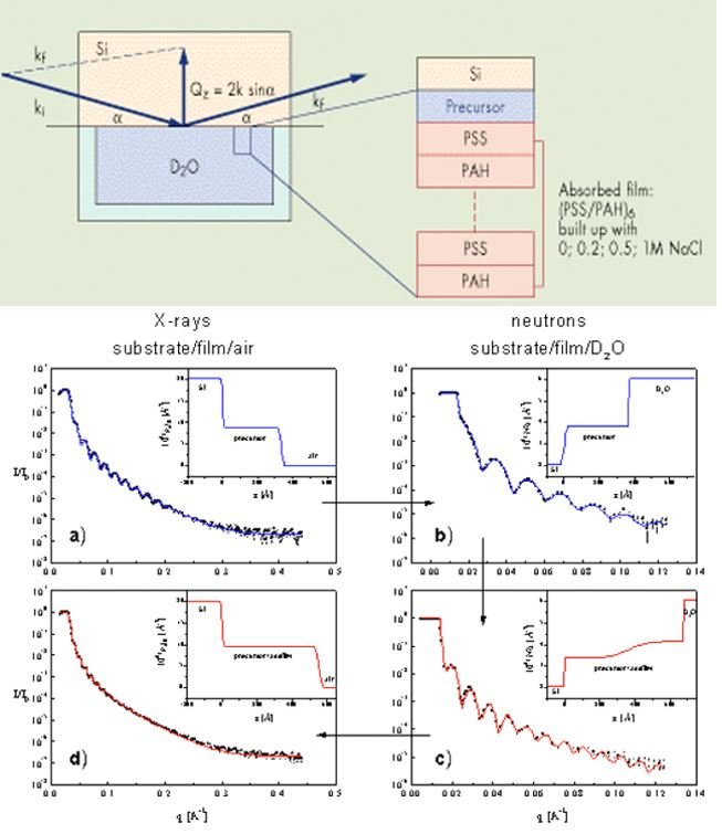 The experiment provides detailed information on the density gradient of polyelectrolyte chains across the films and shows the influence of the water content of the film on the internal structure. The polyelectrolyte density is determined by the adsorption conditions (e.g. amount of NaCl) and cannot be changed by addition of salt after adsorption. After drying, the film thickness is reduced by 30%.
