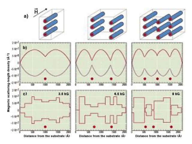 Polarised neutron reflectometry reveals the number of flux-line rows and yields the magnetisation curve, which exhibits unusual behaviour arising from the reduced dimensionality. The filled circles in the lower panel mark the positions of the flux-line rows in an external magnetic field.