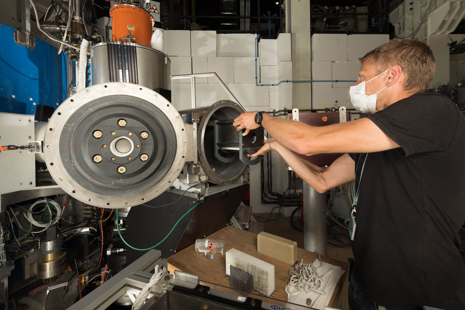 - Benoit Mestrallet placing a freshly polarised 3He cell on D3, the Spin Polarised Hot Neutron Beam Facility. For the transport from Tyrex-2 to the instrument, the cell is placed in a special transport container with the suitable magnetic field to maintain the polarisation. Moving the cell from the container to its location on the instrument without losing the 3He polarisation requires trained operators.