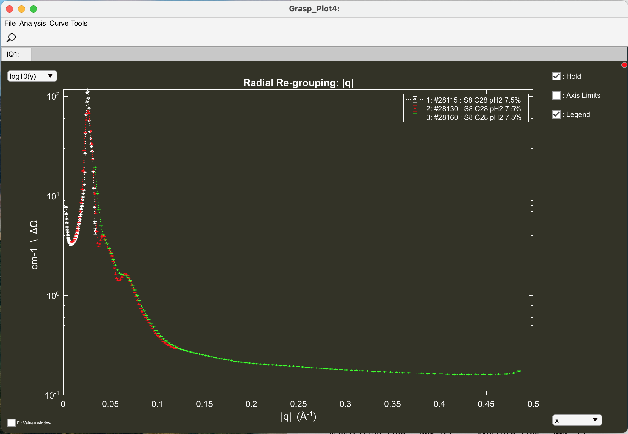 - Click the 'I vs. |q|' button to make a 1D isotropic reduction of the displayed data.