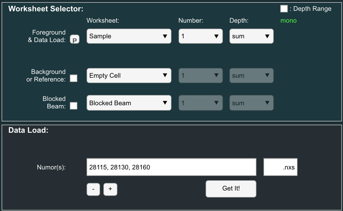 - Enter the run number(s) into the 'Data Load, Numors' box and click the 'Get It' button: e.g. '28115, 28130, 28160'. This loads all of the sample scattering data measured at distances of 28 m, 8 m and 2 m, into the 'Depth' of Worksheet Sample 1: Depths 1,2,3. Note: The comma between the run numbers indicates that the next file should go into the next depth of the scattering data. Hold the mouse hovering over the 'Data Load, Numors' box for tips on more data loading options.