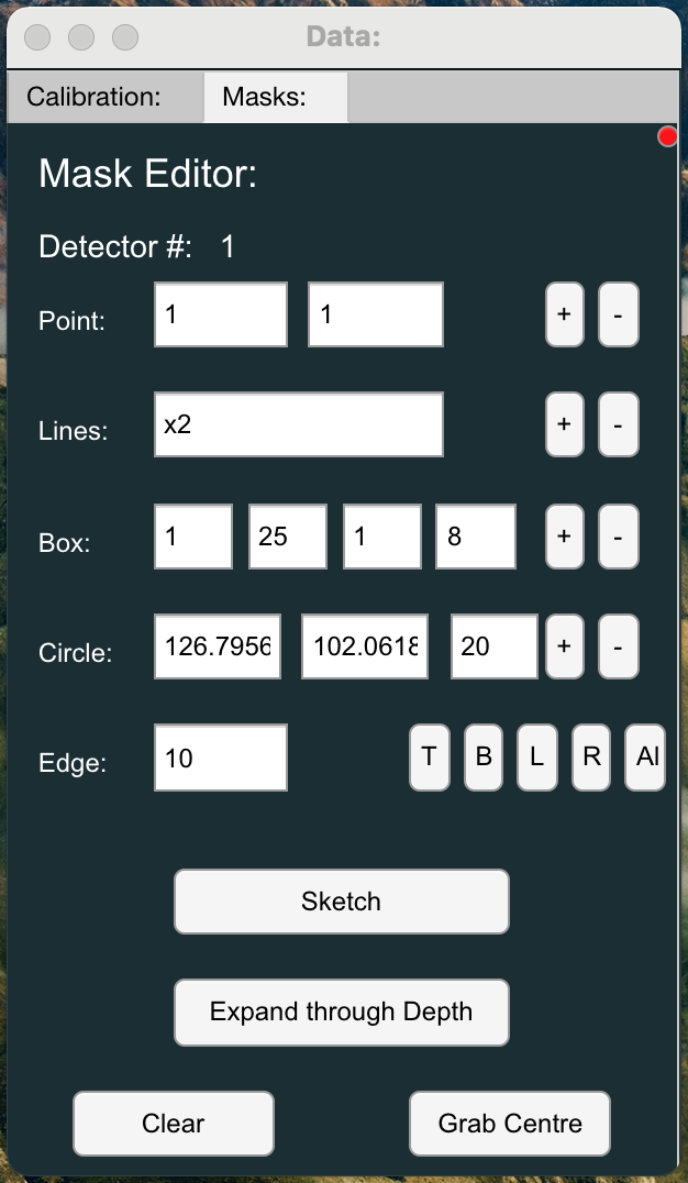 - Mask out unwanted regions of the detector using the various tools to define: Individual pixels, Lines, Box regions, Circles or Edge regions of the detector.