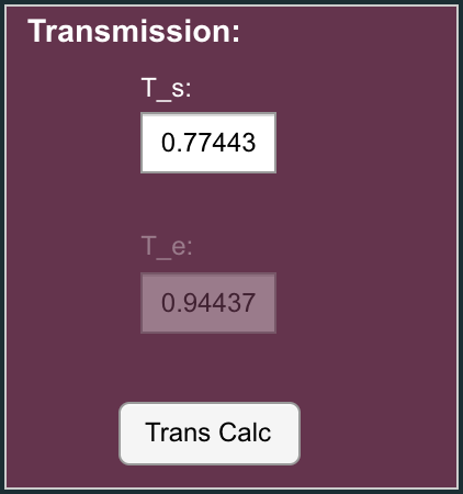 - Click the Trans Calc' button to calculate the sample transmission, Ts. This is the transmission of the sample relative to that of the empty cell (or empty cell + buffer).
