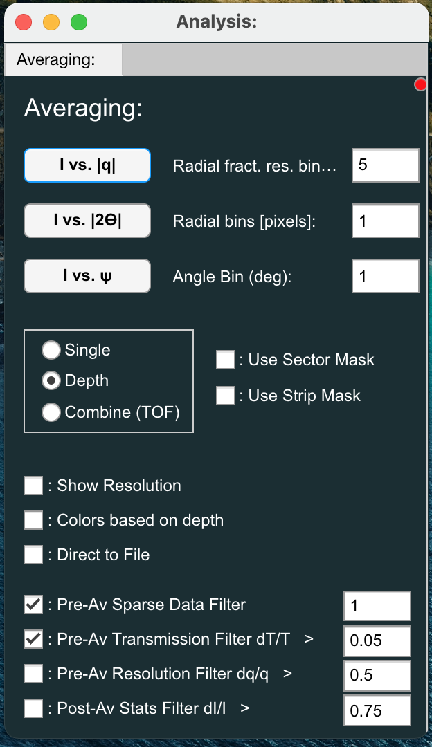 - Open the 'Averaging: Radial & Azimuthal' window from the 'Analysis > Averaging: Radial & Azimuthal' menu (shortcut CTRL-R [Windows/Linux], CMD-R [Mac]).
