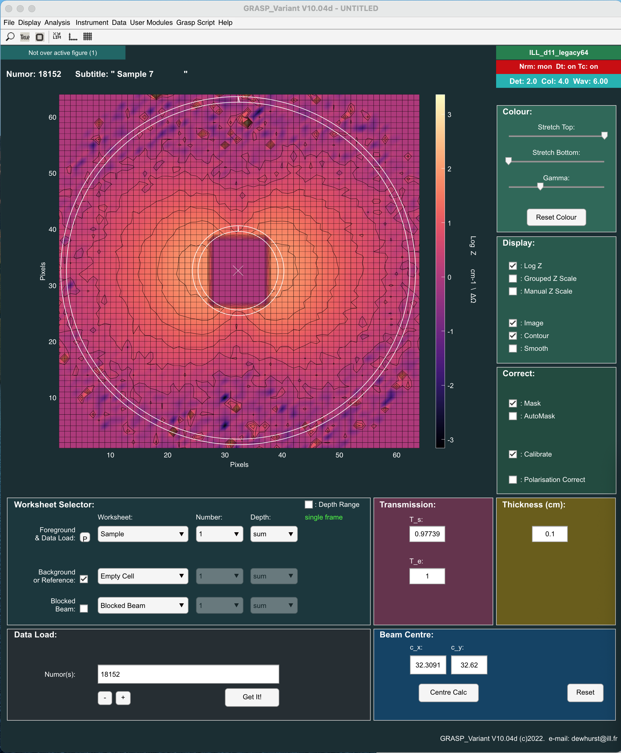 - Click 'Centre Calc'. Grasp will calculate a beam centre this instrument configuration.