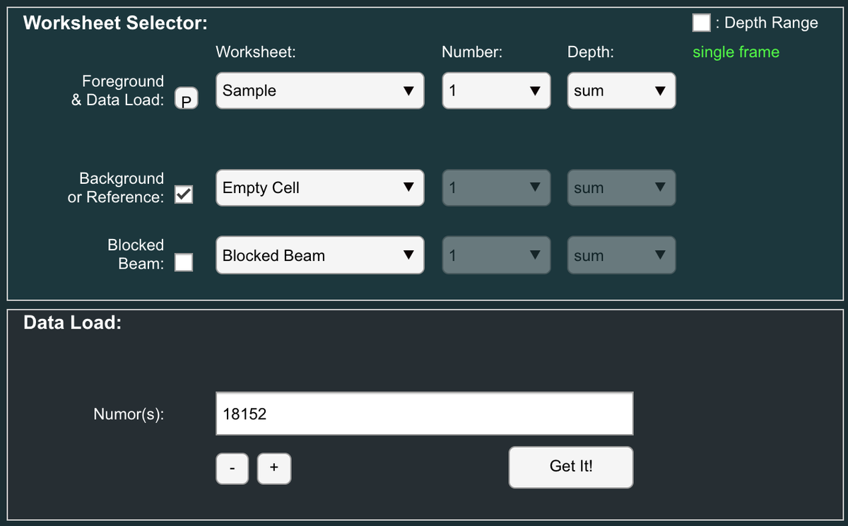 - Enter the run number(s) into the 'Data Load, Numors' box and click the 'Get It' button: e.g. '18152'. This loads all of the sample scattering data measured at a distance of 2 m into Worksheet Sample 1: Depth 1.
