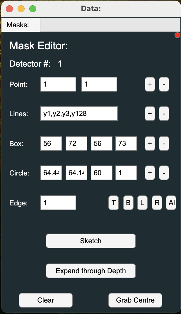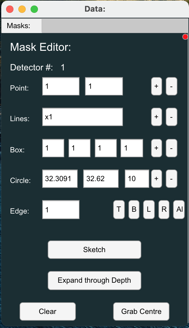- Mask out unwanted regions of the detector using the various tools to define: Individual pixels, Lines, Box regions, Circles or Edge regions of the detector.