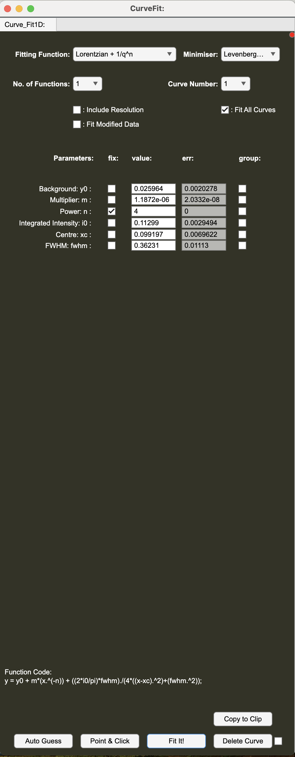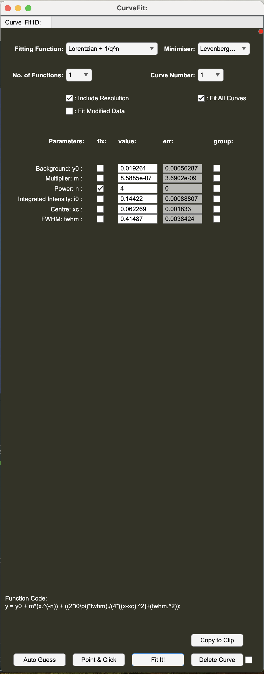 - Tick the 'Include Resolution' checkbox in the Curve Fit panel and run the fit again by clicking 'Fit It!'