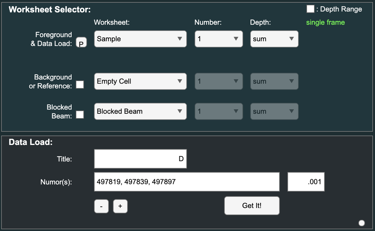 - Enter the run number(s) into the 'Data Load, Numors' box and click the 'Get It' button: e.g. '497819, 497839, 497897'. This loads all of the sample scattering data measured at distances of 1.1 m (4.5 Å), 4 m (6 Å) and 20 m (6 Å), into the 'Depth' of Worksheet Sample 1: Depths 1,2,3. Note: The comma between the run numbers indicates that the next file should go into the next depth of the scattering data. Hold the mouse hovering over the 'Data Load, Numors' box for tips on more data loading options.