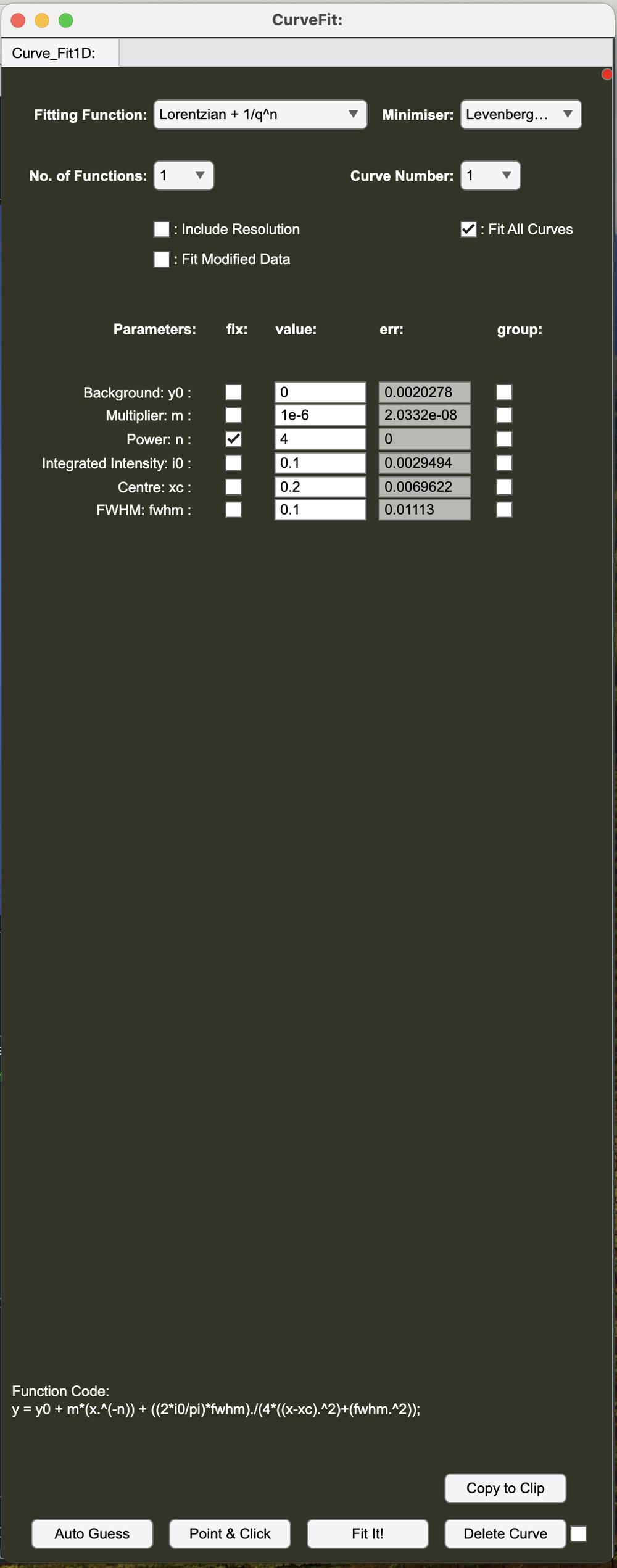 - Open the 'Curve Fi' window from the 'Analysis > Curve Fit' menu in the Grasp_Plot window containing the 1D I vs. Q curve(s).