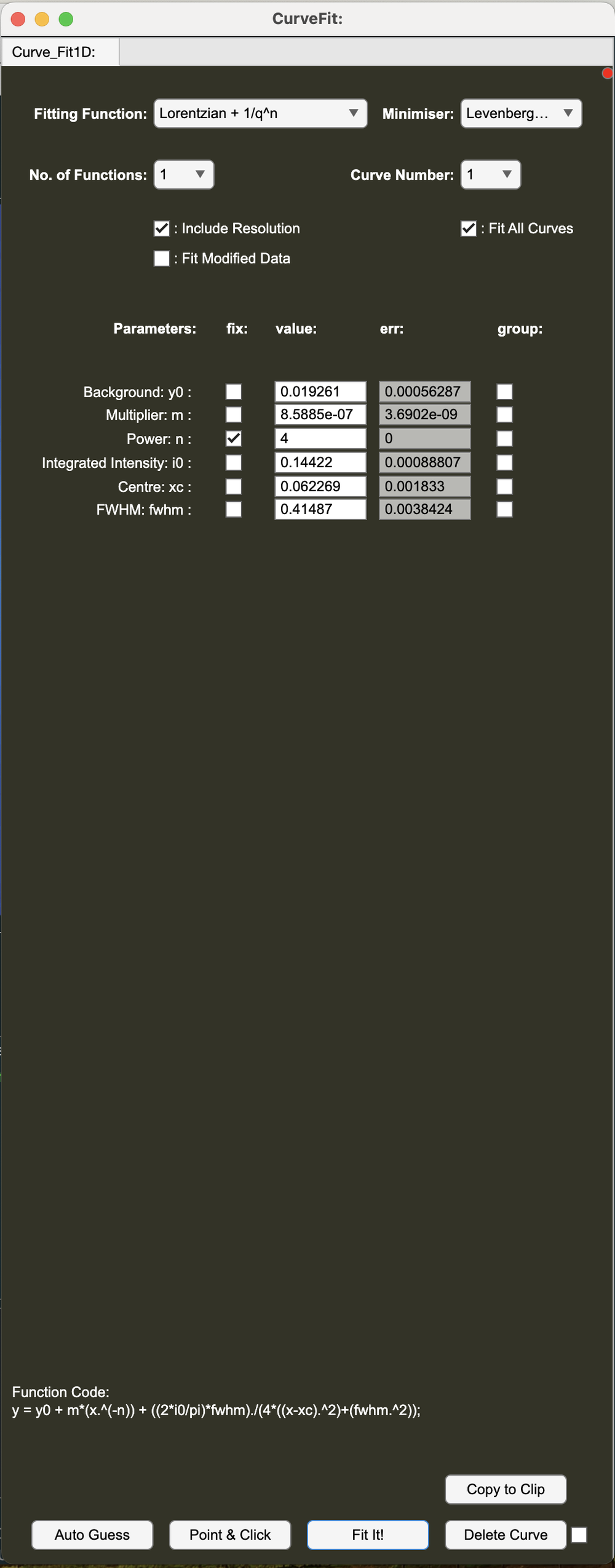 - Tick the 'Include Resolution' checkbox in the Curve Fit panel and run the fit again by clicking 'Fit It!'