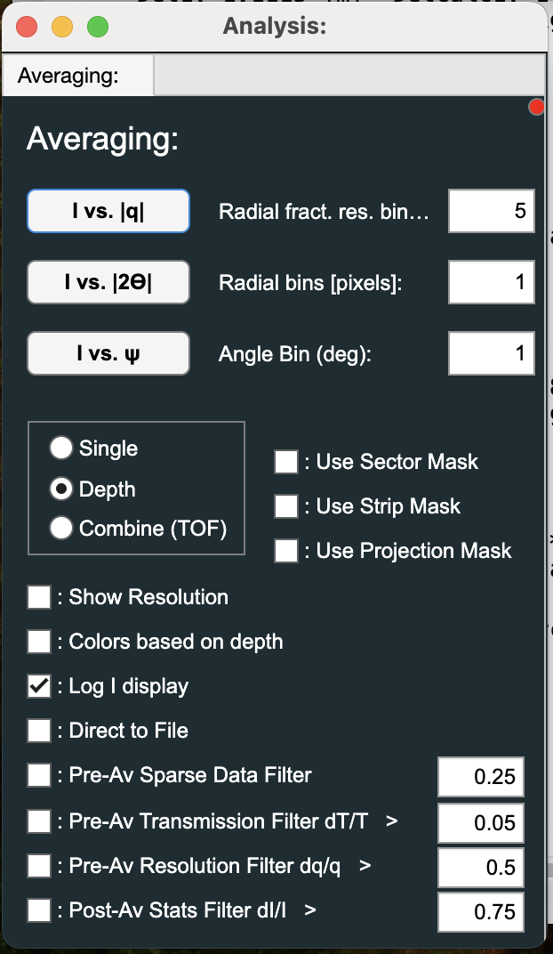 - Open the 'Averaging: Radial & Azimuthal' window from the 'Analysis > Averaging: Radial & Azimuthal' menu (shortcut CTRL-R [Windows/Linux], CMD-R [Mac]).