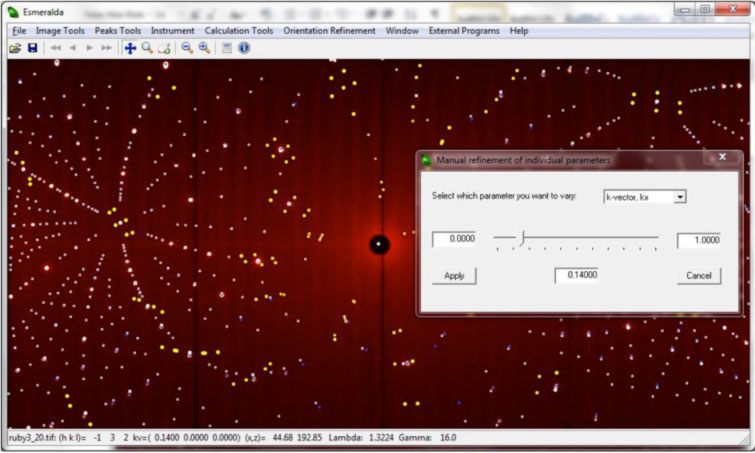 - interactive adjustment of a series of individual parameters (offsets, cell parameters, propagation vector components, minimum d-spacing and wavelength range).