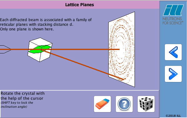 You can sense the relationship between atom planes and the diffraction process. The interactivity makes it easy to demonstrate the link between single crystal diffraction and powder diffraction. This is especially true if a fixed-angle sample rotation is used. - Diffraction of a monochromatic beam by a single crystal
