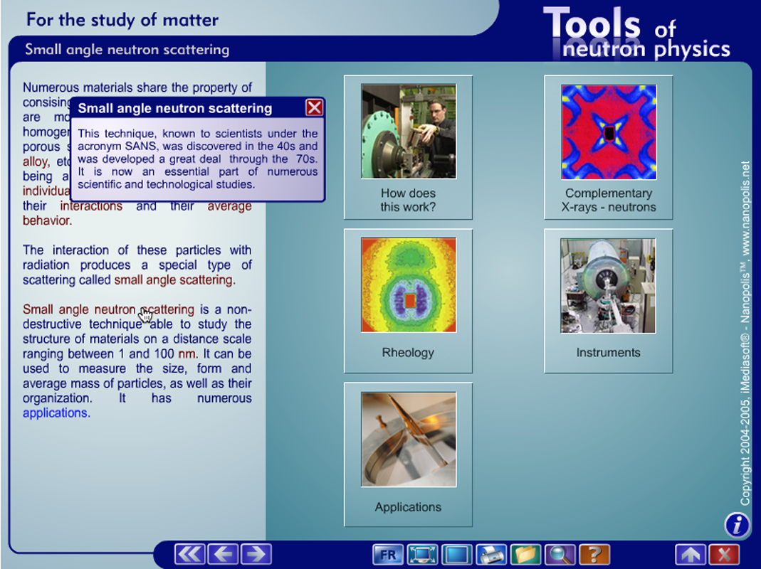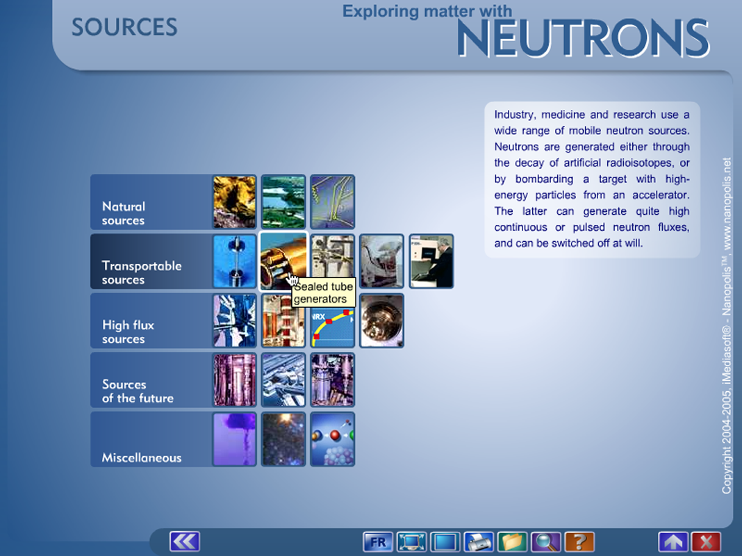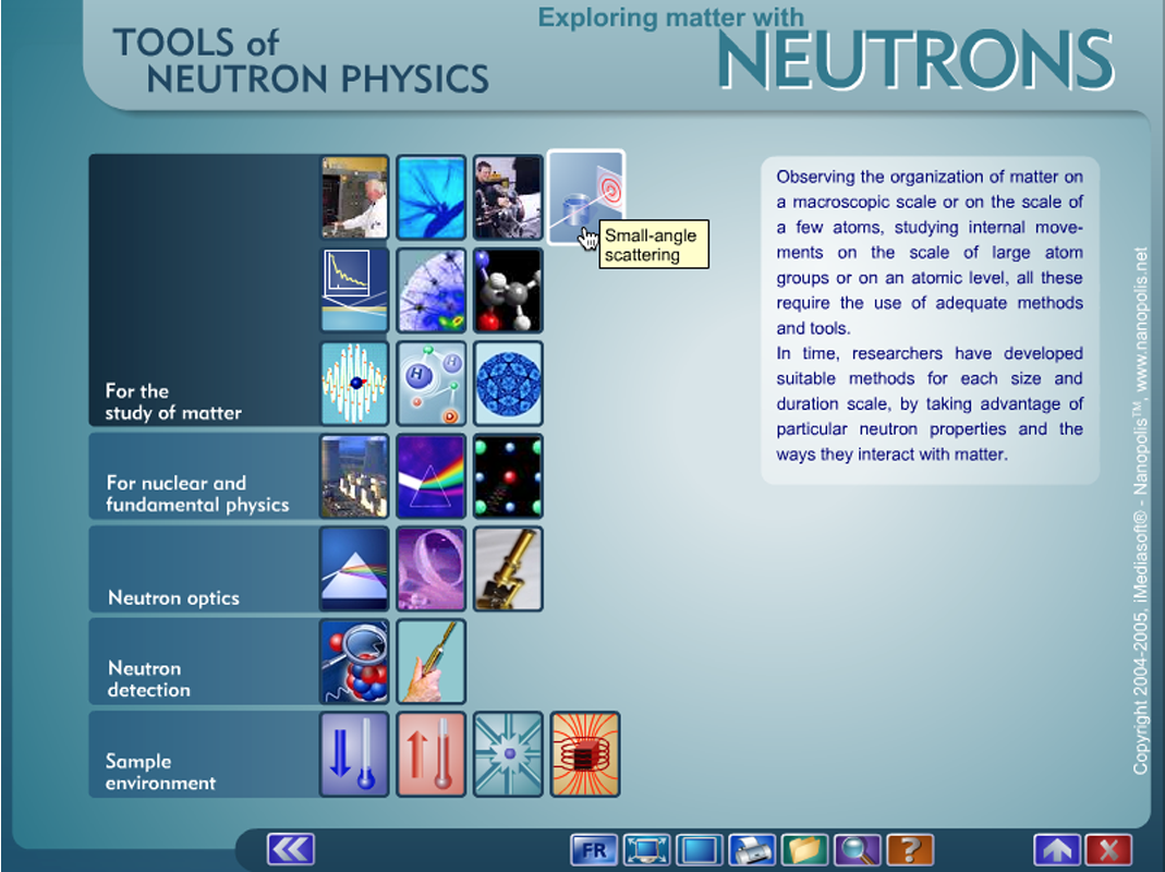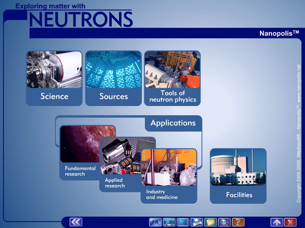 The multimedia encyclopaedia Exploring matter with neutrons was published in English and French in 2004/2005 in the form of a CD-ROM. It is now in the public domain and can therefore be made available here free of charge in the form of a standalone application.