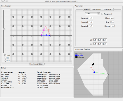 Simulation mode: vTAS allows experimentation with sample parameters, for example the Miller indices of the unit cell, whilst maintaining a representation of the instruments physical state, for example the location of the walls around the instrument, and its angular limits.