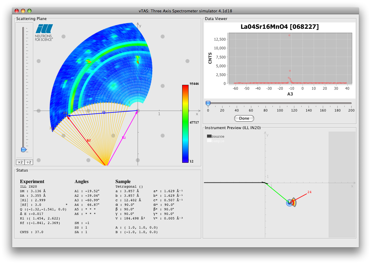 Data viewer mode: vTAS is capable of reading some of ILL TAS data files and the FLEX data files. It displays both the data and the corresponding instrument configuration.