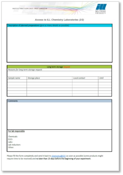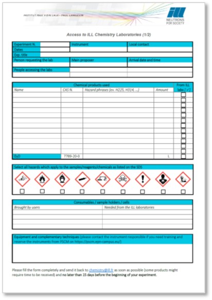 • Chemicals used in the labs: if you need them from ILL, to check that we have them and order them if we don't. If you bring them along, to have a trace of them and of the associated risks. Our nuclear safety officers (following a request of the French "Autorité de Sûreté Nucléaire et de Radioprotection") asked us to record all the chemicals that are present in the labs, belonging to ILL or to our users. This form is our way to do so.