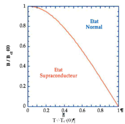 • Tc (B) est la température de transition. Elle dépend du champ magnétique. C'est, pour un champ donné, la température en dessous de laquelle le matériau est supraconducteur. Plus le champ est fort, plus cette température de transition est faible.
