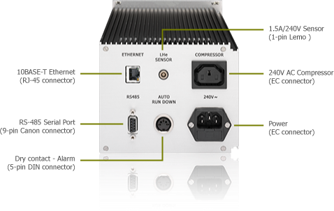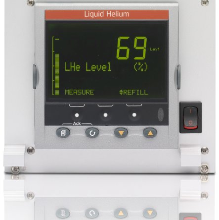 The unit displays permanently the liquid helium level with a bar graph and a number that are visible quite far away from the cabinet. The interval of time between readings is chosen by the user with the aim to reduce the boil-off. Only one button is required to start / stop manually a refill. The message "Refilling..." is displayed when filling.