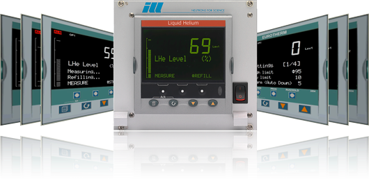 The liquid helium levels of our cryostats are monitored with electronics designed from industrial components. The levels are measured with superconducting sensors built internally. The calibrations, measurements, alarms and automated refills are easily managed with a process controller (Eurotherm model 3504).