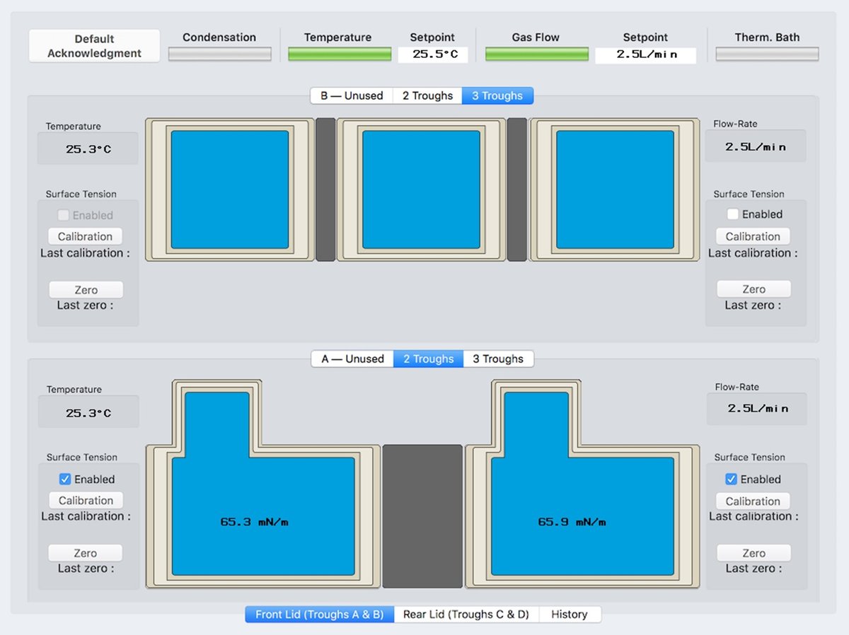 The 8 to 12 adsorption troughs are controlled with a Process Logic Controller M251 from Schneider. This PLC reads the analog signals returned by the surface tensiometers. The temperature of the liquid interfaces are controlled with a thermostatic bath and monitored with compact pyrometers. A gas can be circulated above the interface via a flow-rate controller. In addition, the PLC controls the heating of the neutron and laser windows to prevent condensation. All these devices are controlled from the touch panel of the PLC which is also used to control the Langmuir Trough.