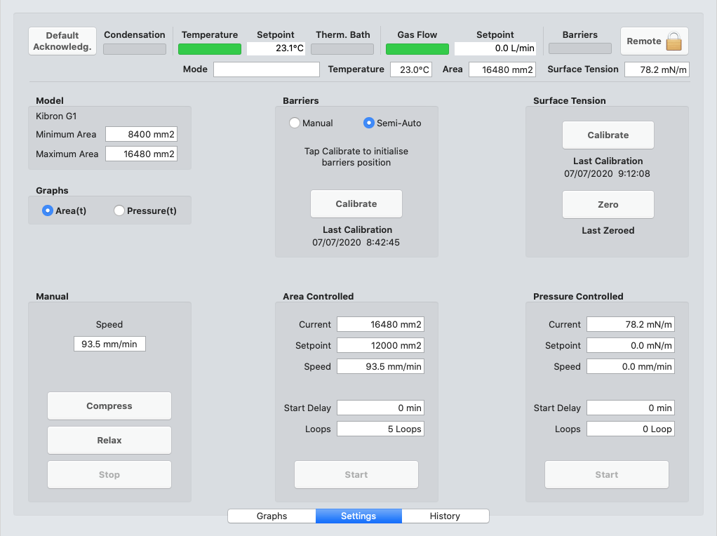 This Langmuir trough is controlled with a Process Logic Controller M251 from Schneider. This PLC reads the analog signal returned by the surface tensiometer and drives the barriers through a Kibron electronics. The temperature of the liquid interface is controlled with a thermostatic bath and monitored with a compact pyrometer. A gas can be circulated above the interface via a flow-rate controller. In addition, the PLC controls the heating of the neutron and laser windows to prevent condensation. All these devices are controlled from the touch panel of the PLC which is also used to control the Adsorption Troughs.