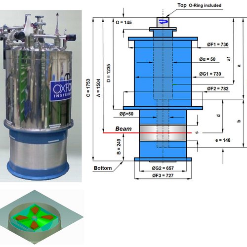 This horizontal cryomagnet provides large symmetric 45° openings: 2 x 45° cones (parallel field axis) and 2 x 45° wedges (perp. field axis).