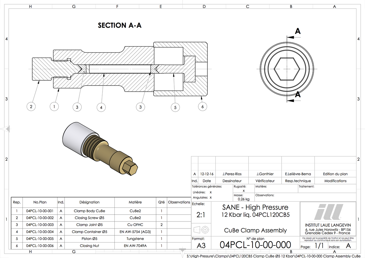 This compact cell is made from a hardened beryllium-copper alloy. It has a Ø5 x 20 mm sample volume. It uses Fluorinert as the pressure medium. The pressure is generated using a hydraulic press, then locked in by an external locknut.