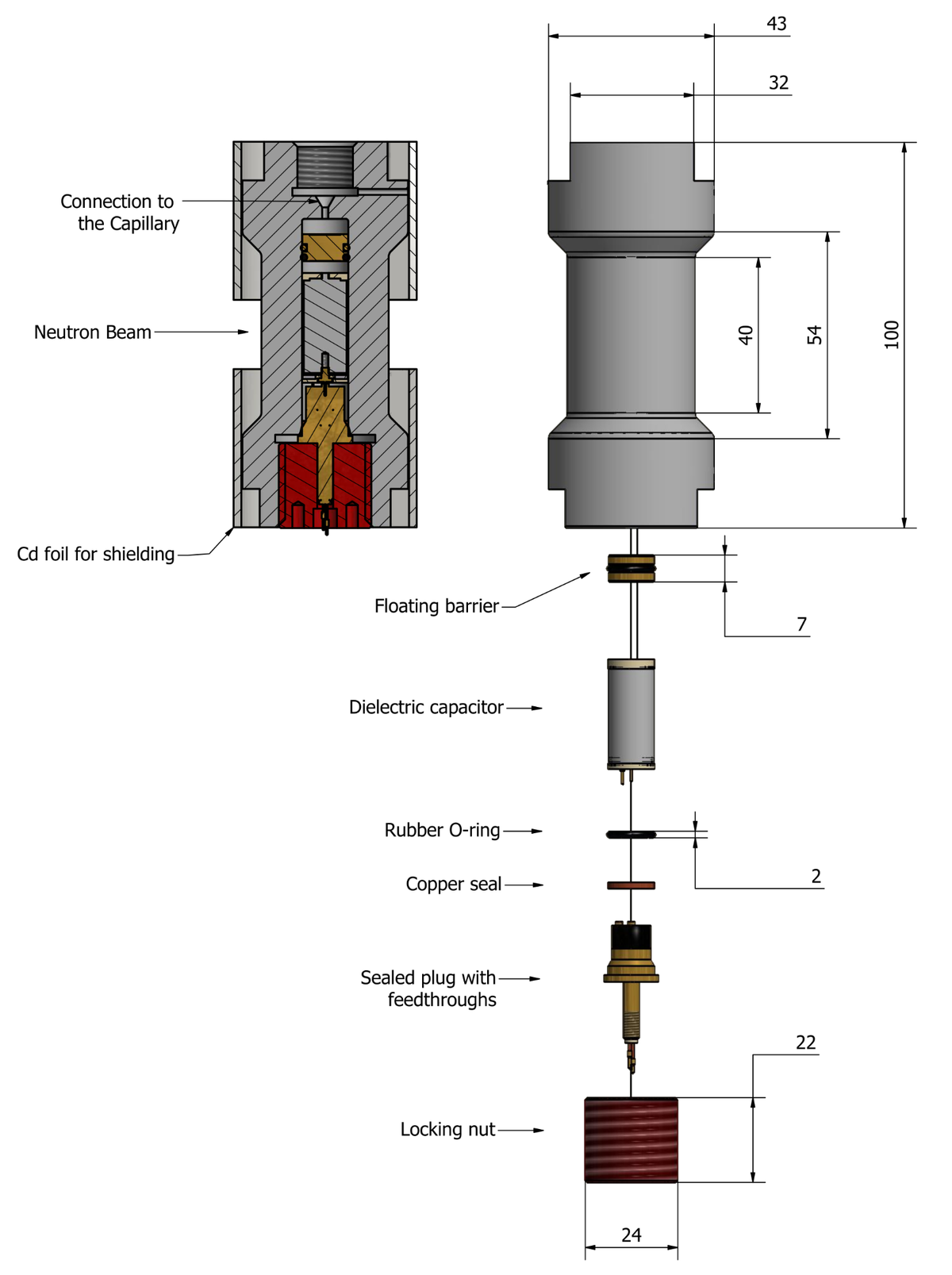 Within the bore of the cell body, there is a coaxial cylinder surrounding a rod. Both the hollow cylinder and the rod, the outer and inner electrodes of the capacitor, respectively, are also made of the aluminum alloy EN AW 7049A-T6. This cell is generally used on IN16B but can be also used on other instruments with or without the electrodes and dedicated sample stick. A complete description of the cell is provided in the article "High-pressure cell for simultaneous dielectric and neutron spectroscopy" published in Rev. Sci. Instr. 89 (2018) 023904.