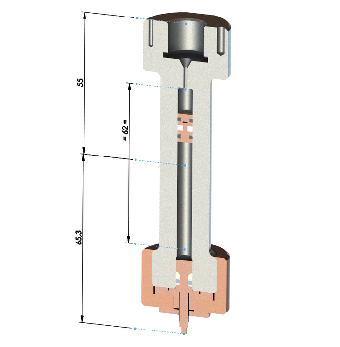 This cell is made from TiZr alloy and provides a Ø6 x 62 mm3 sample volume, i.e. 1.75 ml. A separator may be used when the amount of available sample is low (1.3 ml required).