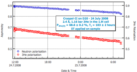 As shown on the graph, the relaxation time of the 3He polarisation was better than 100 hours in the 1.9 litre cell (alias TetraPack) filled at 1.2 bar [more].