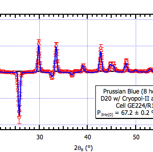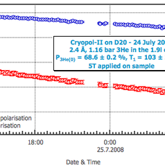 where M10 and M20 are the monitor values measured with the 3He gas depolarised. With the D20 spin filter cells (10 x 8 x 22 cm3), the relaxation decay is about 100 hours at 1.2 bar and 120 hours at 2.2 bar, which is clearly enough for powder diffraction measurements lasting a few hours. During an experiment, care must be taken to check the absence of beam depolarisation between Cryopol-II and the sample position due to instrument imperfections. The depolarisation in the sample can be measured with a Heusler crystal fixed to the sample stick for different applied fields and temperatures. We measure [+] and [-] spectra following the [+][-][-][+] repeated sequence so that we do not integrate the variation of the beam polarisation in the data (first order correction).