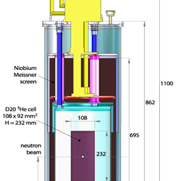 Cryopol-II is installed inside a cylinder of µ-metal box. The whole system is then surrounded by a soft-iron shield that also contains the nutator. Indeed, the simulations show that a very good magnetic connection is required between the nutator and the Cryopol-II soft-iron shields to screen the stray field of cryomagnets. The preparation of Cryopol-II is quite easy : one puts it inside an end-compensated solenoid producing a homogeneous magnetic field of about 8G and starts the compressor of the cold-head.