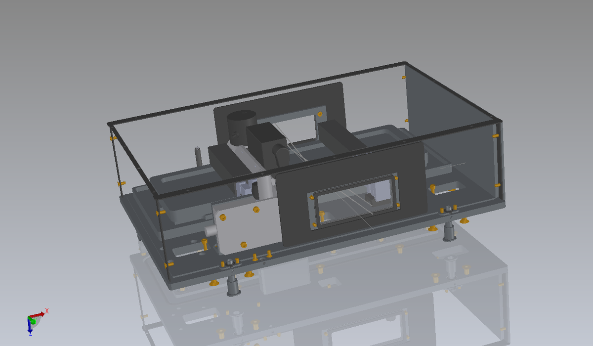 It is possible to circulate a gas at a controlled flow-rate. The chamber is closed with a lid featuring an inclined window allowing the exact position of the liqud interface relative to the neutron beam to be measured. The lid is heated to prevent condensation and Sapphire windows, also heated, close the chamber and prevent spurious neutron scattering in the dectector. B4C plates are also implemented to reduce neutron background.