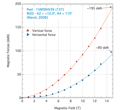 We present the magnetic forces measured on IN20 with the 15T symmetric split-pair coil magnet 158OXHV26. The results obtained in 2007 revealed the presence of strong forces, mostly with the manochromator shielding and the A3 motor block. The results of the measurements shown on the right have been obtained after these modifications.