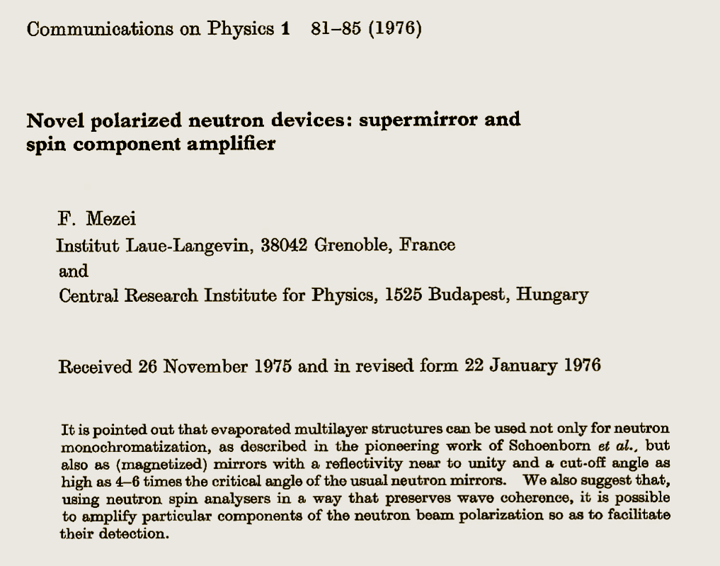"Novel polarized neutron devices: Supermirror and spin component amplifier", F. Mezei., Communications on Physics 1, 81-85 (1976)