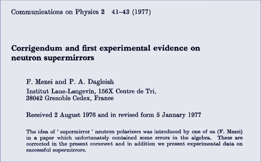 "Corrigendum and first experimental evidence on neutron supermirrors", F. Mezei and P.A. Dagleish, Communications on Physics 2, 41-43, (1977)