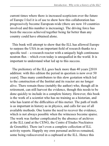 The prehistory of the ILL goes back more than 40 years [2018 addition: with this edition the period in question is now over 50 years]. Thus many contributors to this slow gestation which led to the construction of the Institut and its reactor are no longer alive. There remain those (notably the author) who, though all in retirement, can still harvest the evidence, though this needs to be done quickly to include in a complete history. However, this book is the work of a scientist who has no training as a historian, and who has learnt of the difficulties of this metier. The path of truth is as important in history as in physics, and calls for use of all available methods. One learns the need to recover the evidence, which is not always possible when the witnesses become sparse. The work was further complicated by the absence of archives