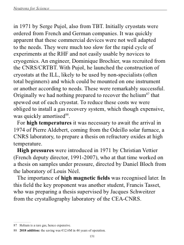 to the needs. They were much too slow for the rapid cycle of experiments at the RHF and not easily usable by novices to cryogenics. An engineer, Dominique Brochier, was recruited from the CNRS/CRTBT. With Pujol, he launched the construction of cryostats at the ILL, likely to be used by non-specialists (often total beginners) and which could be mounted on one instrument or another according to needs. These were remarkably successful. Originally we had nothing prepared to recover the helium87 that spewed out of each cryostat. To reduce these costs we were obliged to install a gas recovery system, which though expensive, was quickly amortised88.